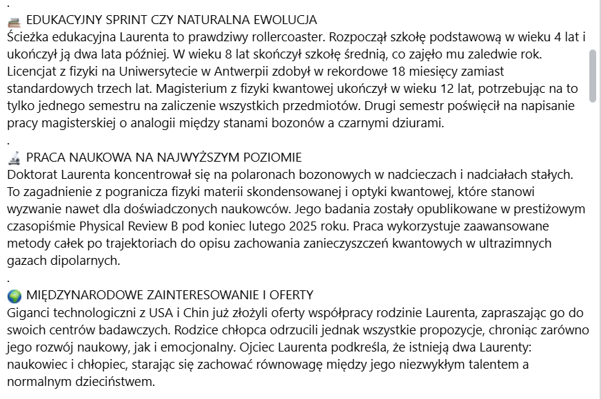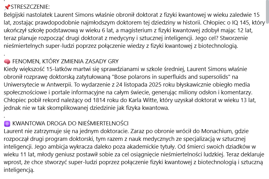Post opiera się na prawdziwym wydarzeniu – Laurent Simons rzeczywiście obronił doktorat z fizyki kwantowej w wieku 15 lat i jest wybitnie uzdolnionym młodym naukowcem. Dezinformacja nie polega tu na zmyśleniu faktów, lecz na ich wyolbrzymieniu i sensacyjnym opakowaniu. Sformułowania o „najmłodszym doktorze w historii”, „rewolucji nauki” czy „tworzeniu nieśmiertelnych super-ludzi” są medialną interpretacją i wizją, a nie potwierdzonymi celami badawczymi. Post silnie operuje emocjami – zachwytem, podziwem i futurystyczną obietnicą – co może prowadzić do mylnego wrażenia, że współczesna nauka jest znacznie bliżej takich przełomów, niż ma to miejsce w rzeczywistości.